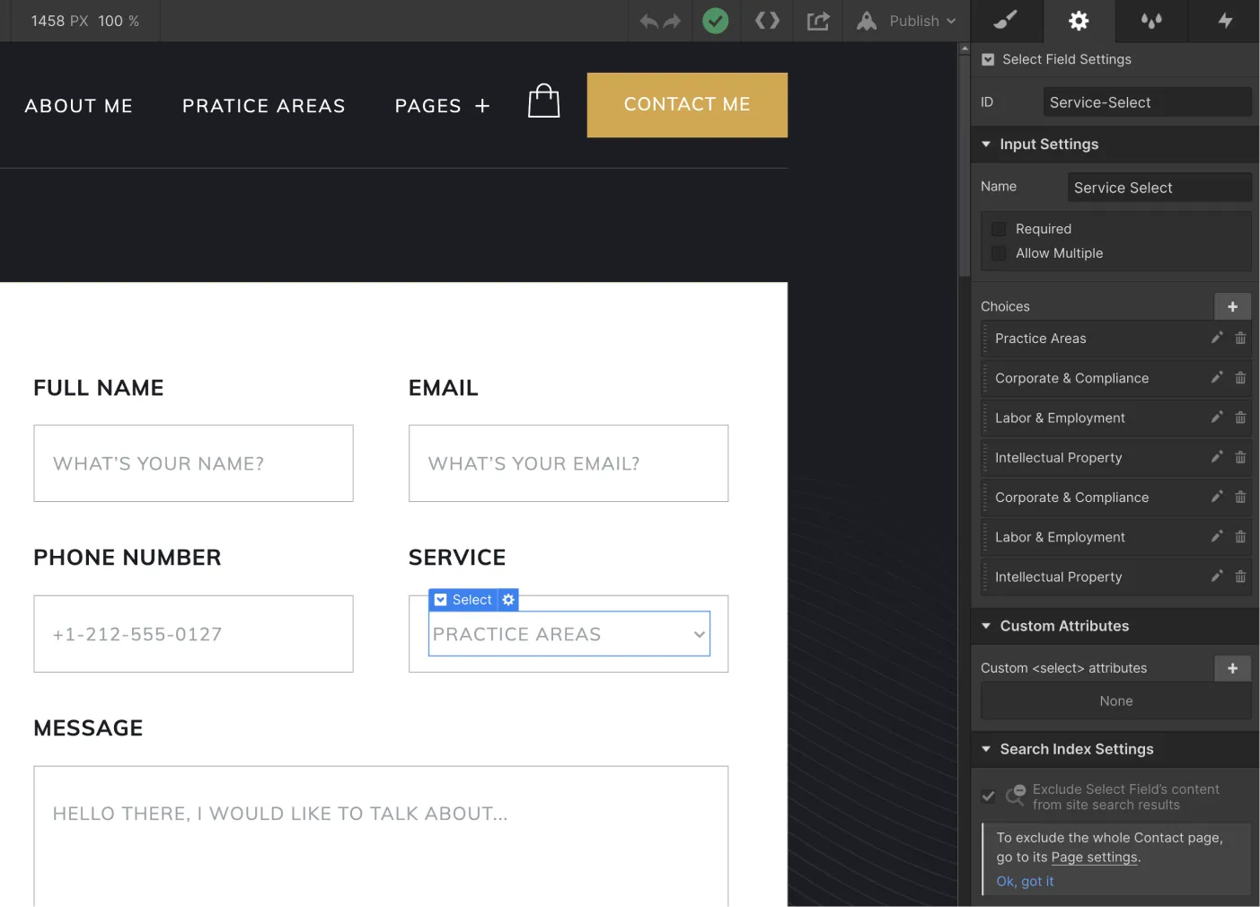 If you want to modify the Practice Areas available in the Contact form, you just need to click on the Form element, then select the field, and you will find the editable options in the Settings tab of the right Webflow sidebar. On this place you will be able to change the Practice Areas as easy as 1, 2, 3.